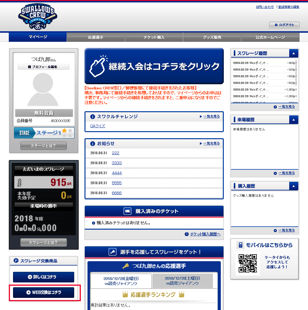 ご注文情報・お届け先は、スワローズクルーの会員情報が自動的に入力されます。